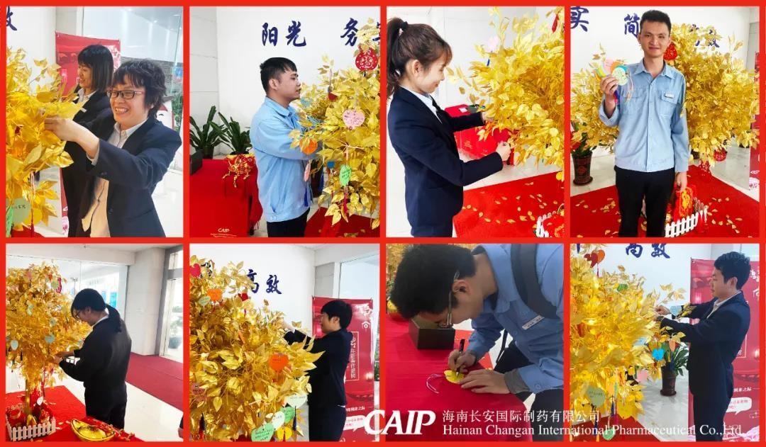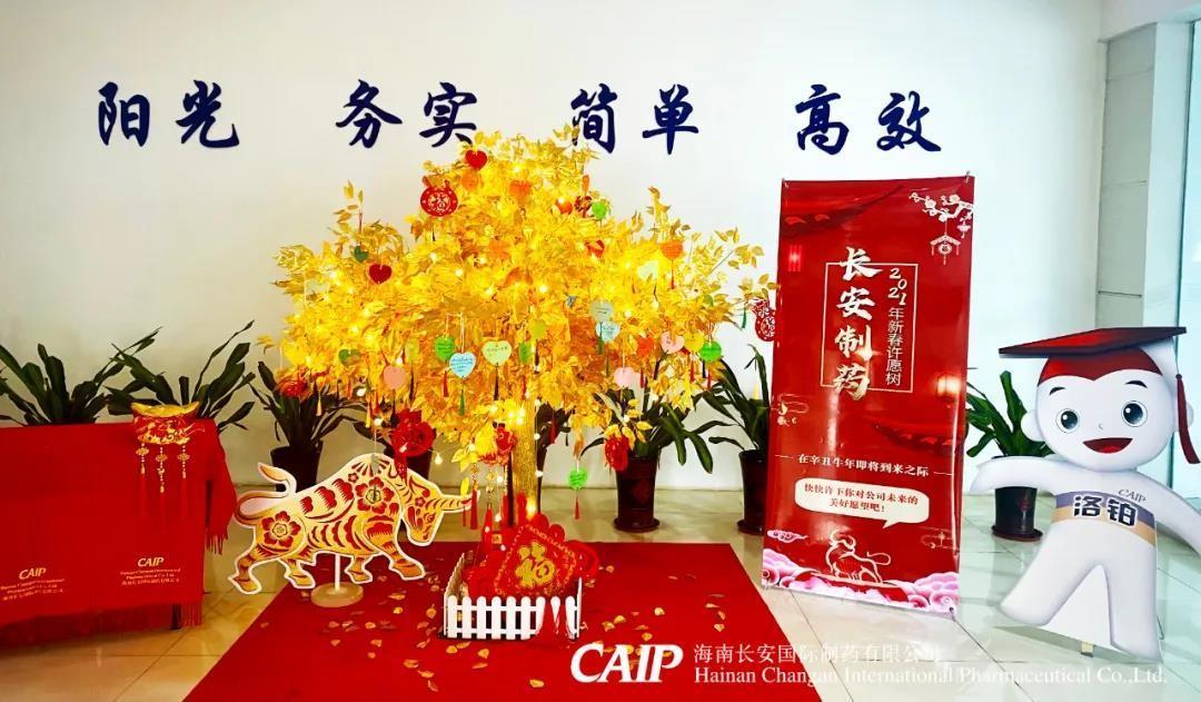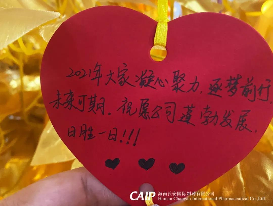 2月2日上午,長安制藥在公司展廳開展了為期8天的2021年新春許愿樹活動,在這歲末年初,桃符更替之時,長安人親手寫下一張張新春寄語許愿卡片,將它掛在金色的樹枝上并帶上美好愿景走入新的一年。