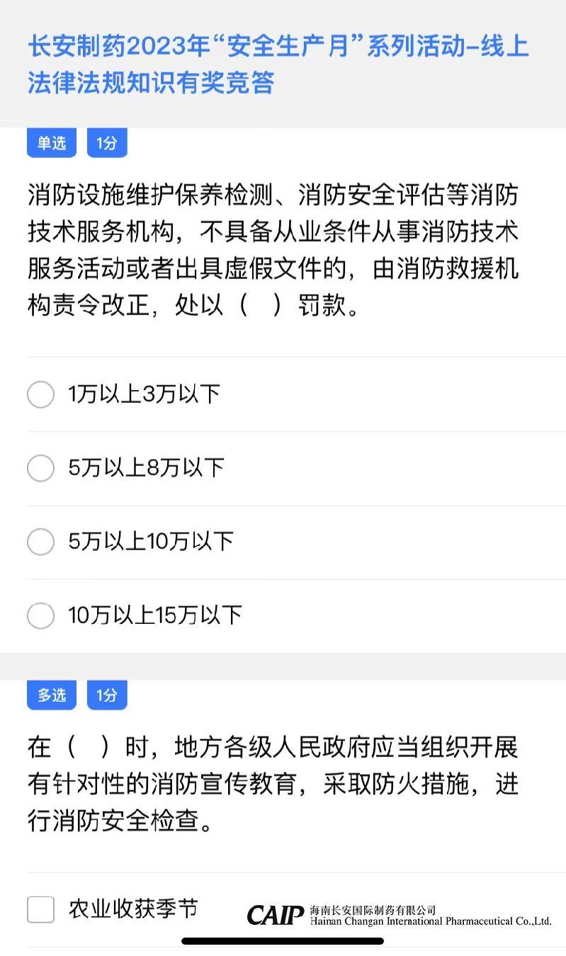 為了進一步提高長安制藥全體員工參與學(xué)法用法的積極性和主動性,長安制藥在安全生產(chǎn)月期間,開展了長安制藥2023年”安全生產(chǎn)月“系列活動——線上法律法規(guī)知識有獎競答,讓員工在競答中學(xué)習(xí)掌握法規(guī)知識。