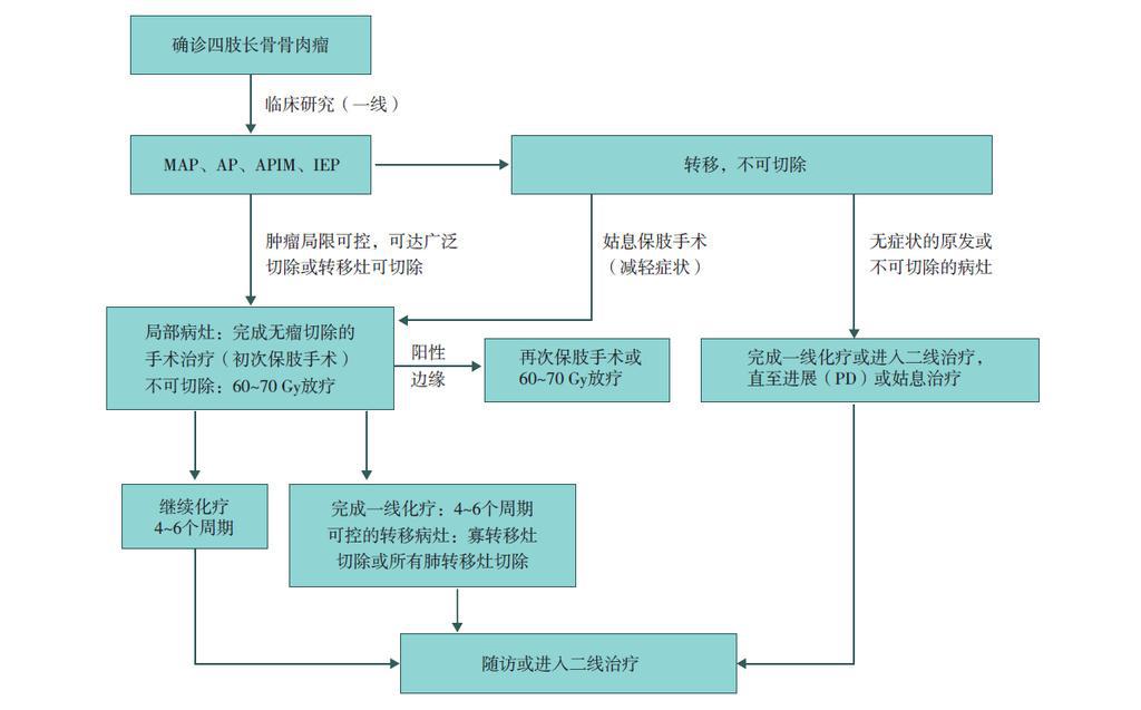 保肢治療指經(jīng)典型骨肉瘤在多學(xué)科團(tuán)隊(duì)醫(yī)生共同努力下完成的新輔助化療、保肢手術(shù)和輔助化療等一系列治療總稱,其目的是在提高患者生存率的前提下,減少局部復(fù)發(fā)、盡量保留良好的肢體功能。肢體經(jīng)典型骨肉瘤保肢治療方法如下圖所示: